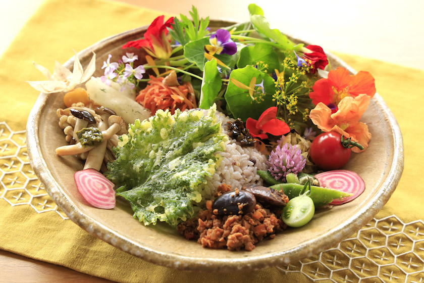 自家菜園や地域で収穫した旬の野菜や彩り豊かなエディブルフラワーなどを使い、華やかにside dishを仕立てました。
